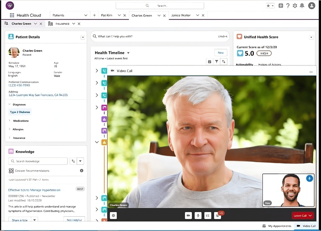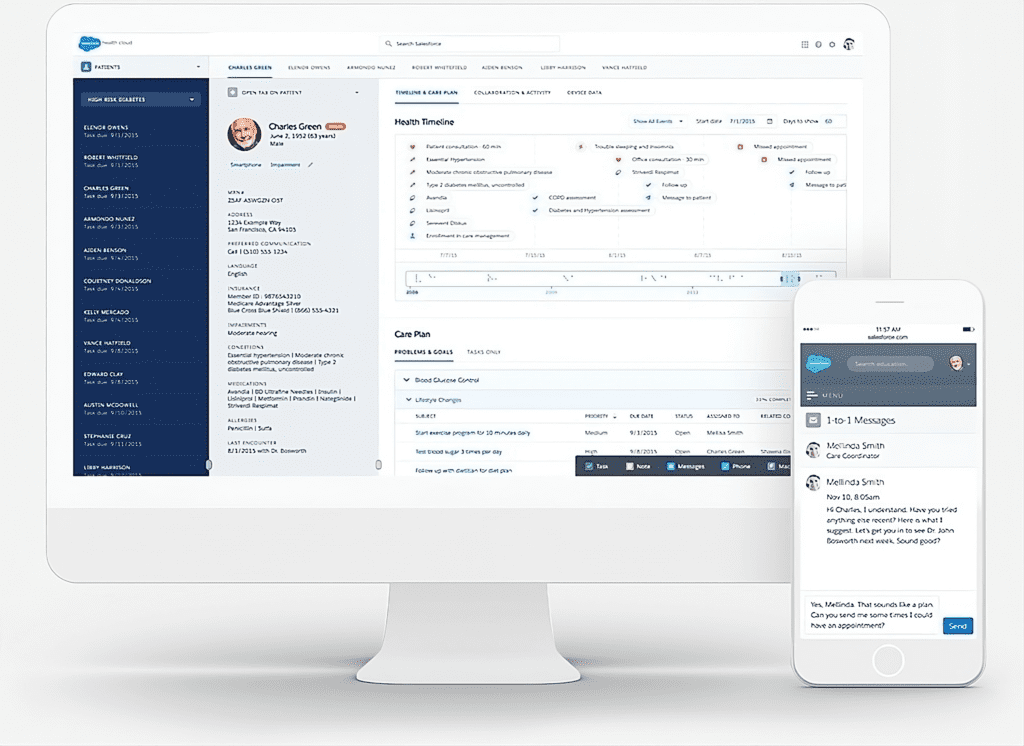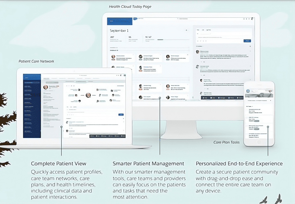 • Salesforce Health Cloud: This core system manages patient care, offering features like appointment scheduling, care coordination, and patient engagement.