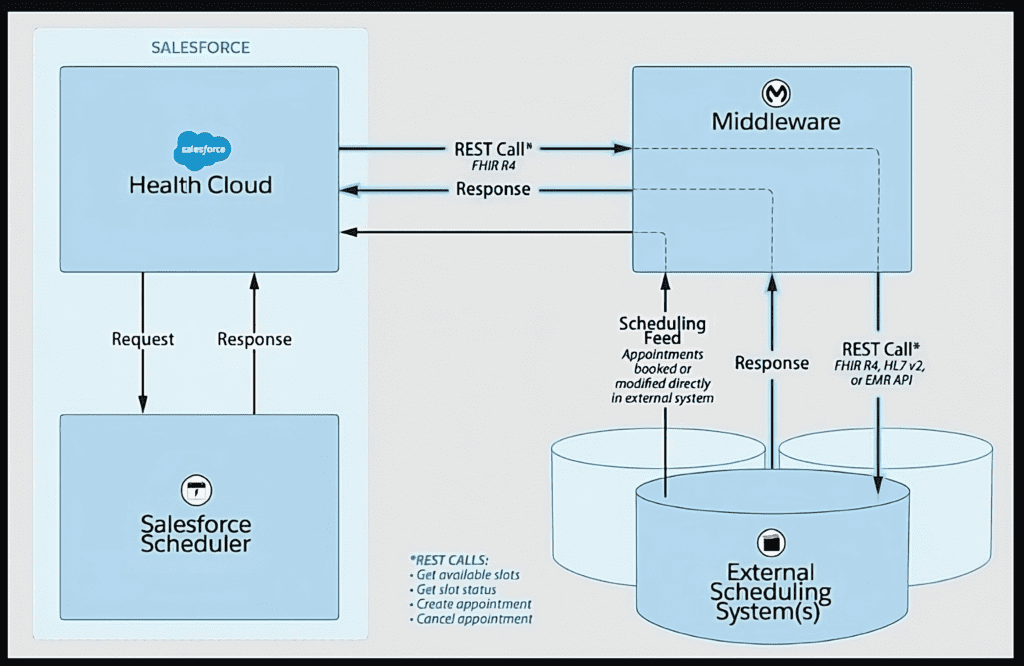 REST callouts from Health Cloud point to the source system of truth for appointment availability and booking.